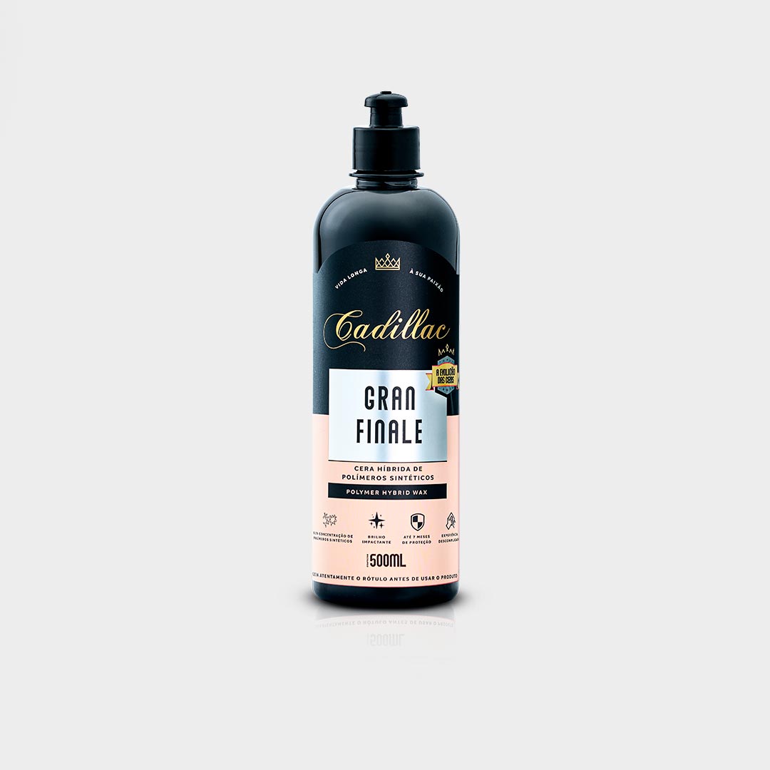 A Gran Finale Creme é a evolução das ceras. Sua formulação possui concentração máxima de polímeros sintéticos de última geração que vão proporcionar proteção de até 7 meses, resistência a químicos, proteção UV e espetacular repelência à água. Essa tecnologia combinada as ceras de carnaúba tipo exportação e cera de abelha vão agir resgatando o brilho e a intensidade de cor da superfície.